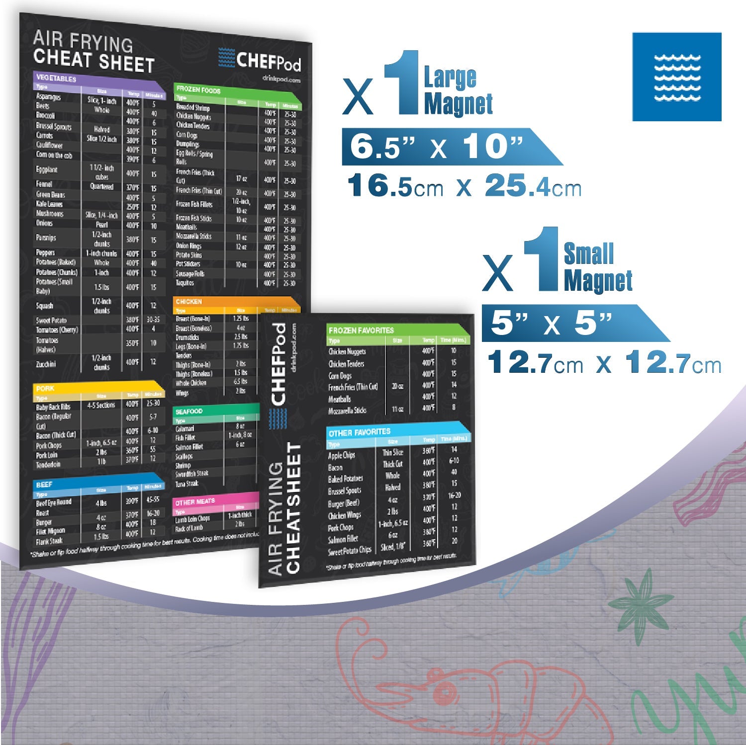 SUPERIOR QUALITY: Made with quality in mind, our magnetic cheat sheets are designed for air fryers to last even when used daily. The durable material ensures that these waterproof and oil-proof cards won't fall apart after long term use! With 2 different size options available including the Large Magnet (10.5 x 6.5” ) & Small Magnet (5 x 5”), you will always have a large variety of recipes to create amazing food.