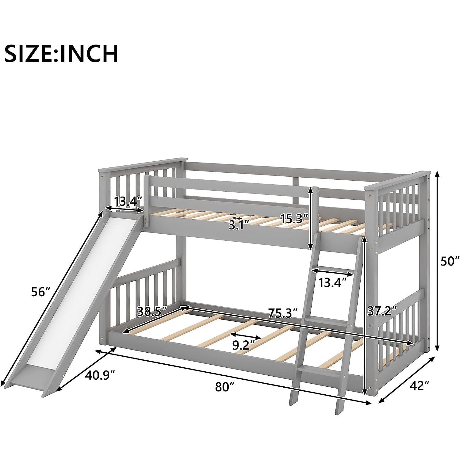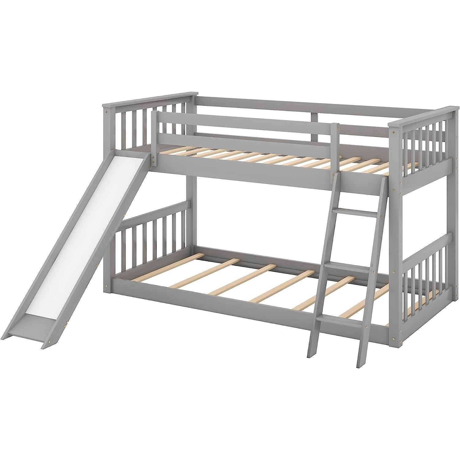 Grey Twin Bunk Bed with Slide - Solid Pine, Low Bunk