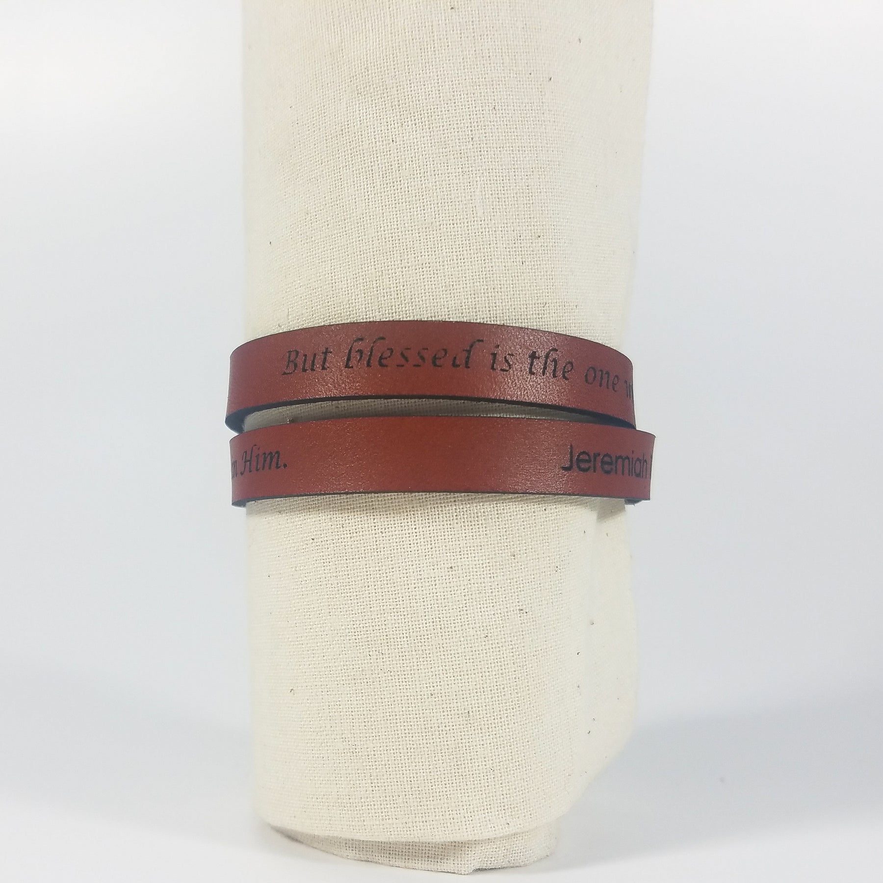 Our spiritual quote wrap bracelets are laser etched on vege-tanned genuine leather. Bracelets wrap around wrist twice and include the chapter reference.