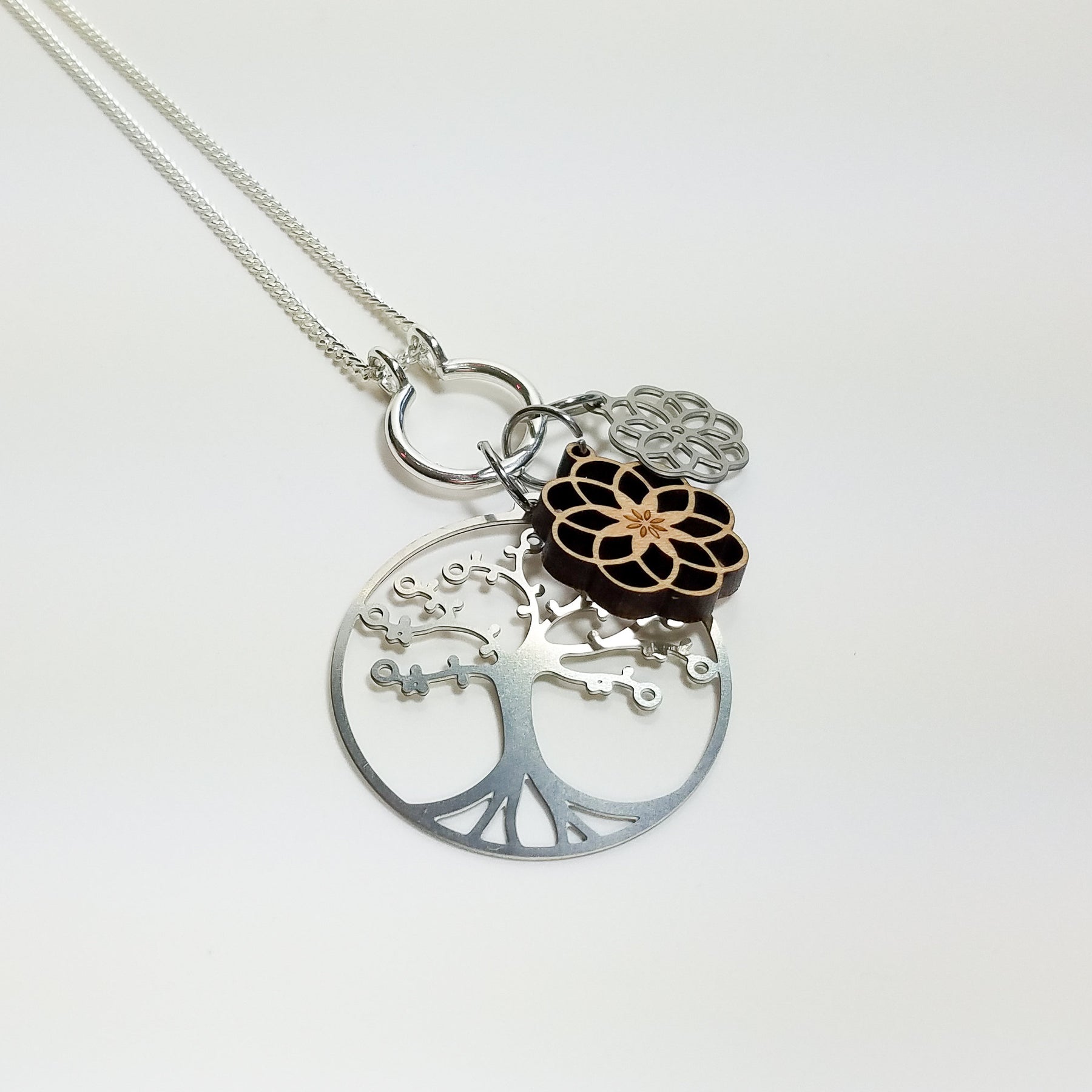 Tree of Life Charm Necklace. Stainless steel and cherry wood charms, 30" long silver-plated chain. Sterling silver charm keeper - its open end lets you add more charms if desired. From our Natural Collection - organic designs inspired by flora and fauna. Our mission with our Jewelry Collection is to offer a unique and fresh line of jewelry featuring alternative materials (leather, wood, stainless steel) and elegant, clean design.