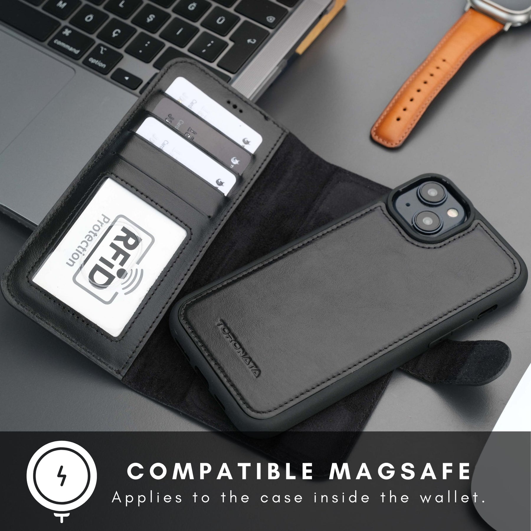 Toronata's leather iPhone 14 Plus wallet case, your valuables are always close at hand and secure. The Casper wallet phone case by TORONATA is designed to fit the iPhone 14 Plus 6.7-inch model. It is an elegant, full-grain leather cover that blocks RFID signals and has card slots and a kickstand.